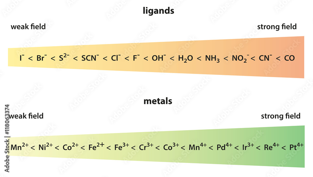 Αυτό δίνεται από την φασματοσκοπική σειρά των υποκαταστατών: Υποκαταστάτες που προκαλούν απο μικρό Δ προς μεγάλο Δ : I-, Br-, S2-, SCN-, Cl-, NO3-, N3-, F-, OH-, H2O, NCS-, CH3CN-, Pyridini, NH3, αιθυλενοδιαμίνη, 2,2΄διπυριδίνη, phen(1,10)- , NO2, τριφαινυλοφωσφίνη, CN-, CO,