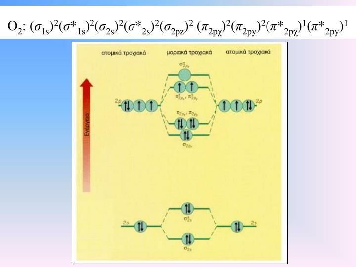Θα μπορούσαμε ακόμα να δούμε πως συνδυάζονται τα ατομικά τροχιακά δύο μορίων οξυγόνου για να δώσουν τα μοριακά τροχιακά του διατομικού μορίου του οξυγόνου