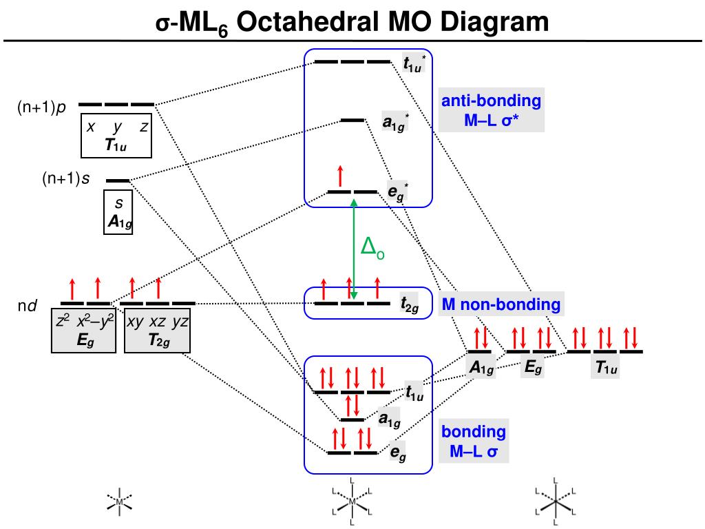 Εδώ σε ένα οκταεδρικό σύμπλοκο συμμετάχουν τα έξη ατομικά τροχιακά του συνδέτη (Μέταλλο Μ)
