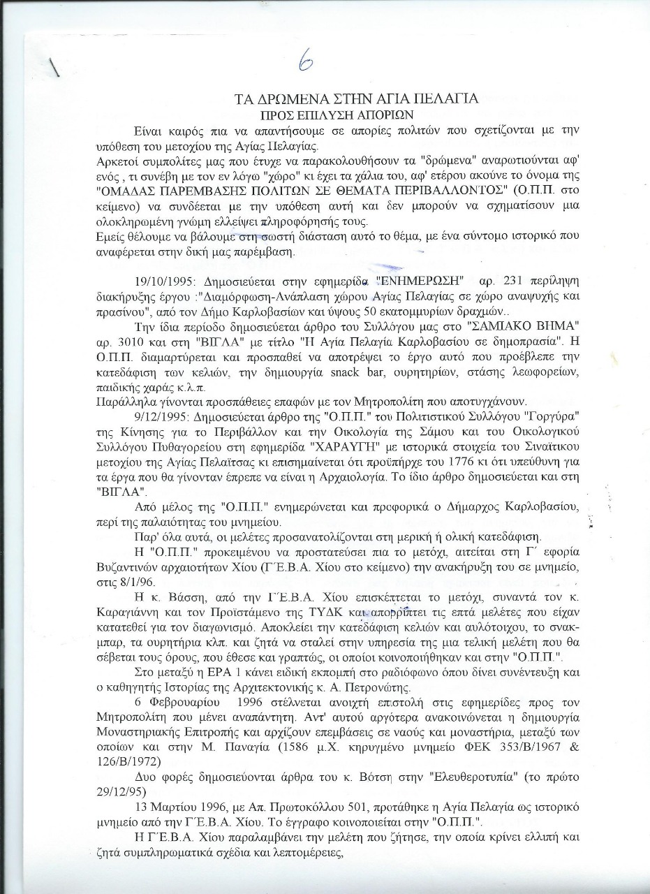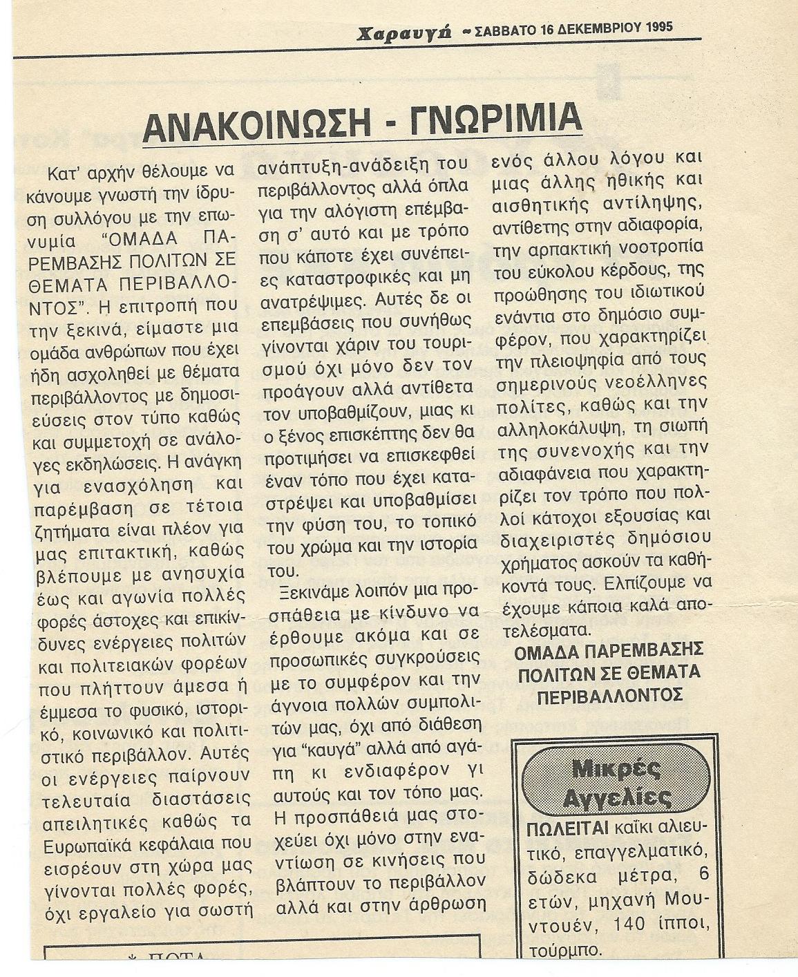 Ο ΣΥΛΛΟΓΟΣ" ΟΜΑΔΑ ΠΑΡΕΜΒΑΣΗς ΠΟΛΙΤΩΝ ΣΕ ΘΕΜΑΤΑ ΠΕΡΙΒΑΛΛΟΝΤΟΣ" ΑΣΧΟΛΗΘΗΚΕ ΚΑΙ ΑΓΩΝΙΣΤΗΚΕ ΓΙΑ ΤΗΝ ΔΙΑΣΩΣΗ ΚΑΙ ΚΑΛΛΙΤΕΡΕΥΣΗ ΤΟΥ ΠΕΡΙΒΑΛΛΟΝΤΟΣ, ΜΕ ΔΡΑΣΕΙΣ, ΕΝΗΜΕΡΩΣΗ, ΔΗΜΟΣΙΕΥΣΕΙΣ, ΤΡΙΒΗ ΚΑΙ ΣΥΝΕΡΓΑΣΙΕΣ ΜΕ ΦΟΡΕΙΣ, ΤΟΠΙΚΟΥΣ ΚΑΙ ΠΑΝΕΛΛΗΝΙΟΥΣ.